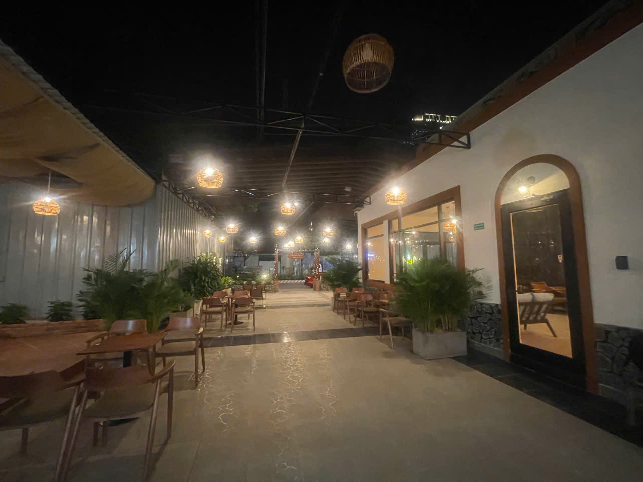 Không gian thoáng mát và chill. Gồm 2 phòng lạnh 60m2 và 30m2, không gian sân vườn rộng 200m2, Có mái che bạt xếp, cây xanh, hệ thống phun sương làm mát mái. Ngoài ra cong có 1 phòng 30m2 cho nv ngủ lại, 2 khu WC nam nữ riêng, bếp nấu và chế biến rộng 100m2, có sẵn 3 kệ inox cực lớn dùng chế biến và soạn chia, chậu rửa đôi lớn, 10 cái kệ sắt 4 tầng, 6 bộ bàn ghế ăn bằng gỗ, cùng 1 số bát đĩa, nồi nấu, máy phát điện, ... Chỉ cần đầu tư thêm bếp nấu và bàn ghế.